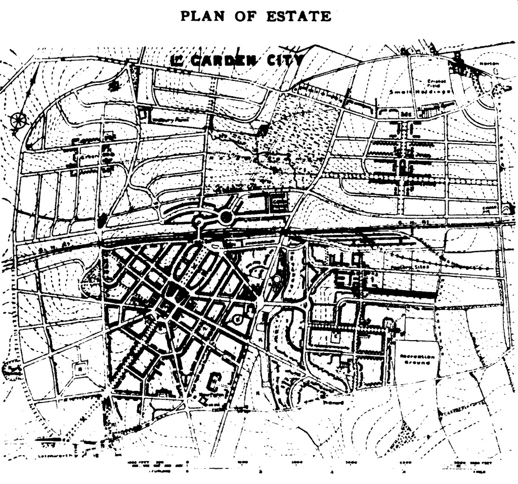 In 1898 an unknown Court Reporter named Ebenezer Howard publishes a book entitled: ‘To-morrow – A Peaceful Path to Real Reform’. The book sets out Howard’s vision for what he sees as the answer to overcrowded cities and the lack of affordable good housing for the working class. Howard not only has a plan for how towns are designed but also where they are located. Existing cities should be encircled by a band of greenbelt, a vast area of countryside which cannot be built on, so as to contain urban sprawl and protect the beauty of rural regions. Beyond the greenbelt should be satellite towns of limited size, surrounded by their own green belt, which Howard describes as Garden Cities. Garden Cities should provide beautiful and imaginatively designed housing for all, regardless of class and social standing. Howard also specifies that districts should be of mixed class, i.e. large houses adjacent to small cottages. He puts emphasis on the benefits of outdoor recreation and leisure activities, since he believes this is key to health and well-being, in addition; provision should be made for residents to have access to allotments in order to grow their own fruit and vegetables. Howard also specifies that jobs should be provided by local industry within the town and be within easy commuting distance. Howard offers a vision of towns free of slums, which enjoy the benefits of both town (such as opportunity, amusement and good wages) and country (such as beauty, fresh air and low rents). In order to invigorate community spirit and provide funds for upkeep, Howard specifies that the natural increase in value of the land should return to the community.