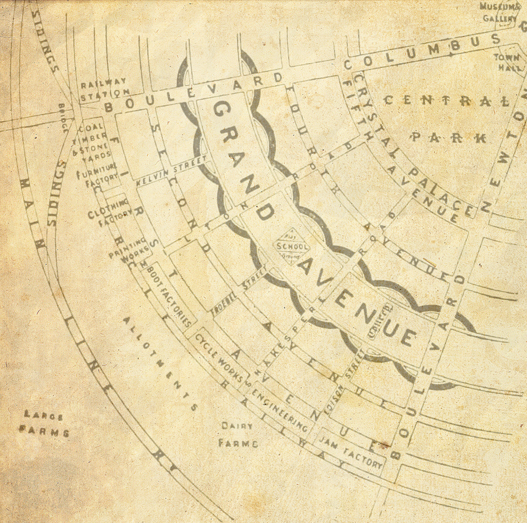 plots for houses with landscaped parkway roads. Observing the planned renaissance of the area proves highly influential to the young Howard. Interestingly, at the time of Howard’s visit, Chicago is known as The Garden City.